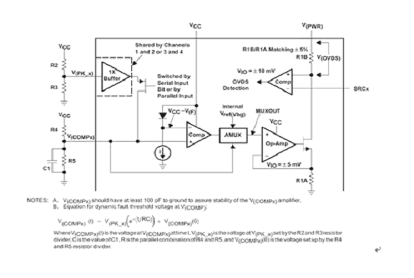 當(dāng)該特定通道處于“關(guān)閉”狀態(tài)時,經(jīng)過編程的 VPEAK(X) 值被反映在 VCOMP(X) 上。如果一個特定通道被開啟,那么過電流檢測的參考電壓就為動態(tài),并且用內(nèi)部 VPEAK 設(shè)置和VCOMP(X) 終端外部組件值表示。