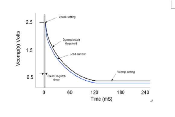 根據(jù)時間的變化對一個以電壓形式表示的過流故障閾值進行調(diào)節(jié),以對燈泡燈絲電阻的變化進行補償(如圖2所示 )。