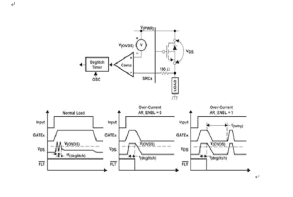 當(dāng)檢測到一個過電流狀態(tài)時,通過“關(guān)閉”器件或激活將以低占空比自動重試和 “開啟”FET 的選項設(shè)置,就可以對 FET 進行保護。這樣就允許系統(tǒng)不斷地檢查故障是否已經(jīng)被排除,并且不會破壞 FET。圖3顯示了這種過電流檢測保護的原理圖。