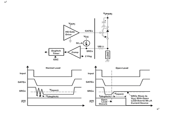如果檢測到一個開路負載或高阻抗,那么小恒定電流將使開路負載檢測閾值以上的 SRCx 節(jié)點發(fā)生偏置,進而檢測到故障(見圖4)。