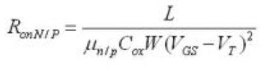 低導(dǎo)通電阻是模擬開關(guān)在音頻切換用途時的主要選擇因素。值得注意的是,導(dǎo)通電阻是針對具體的VCC 、VIN(電壓輸入)及給定負載電流而定義的。在晶體管級,RON為起始長度(L)、寬度(W)、電子與空穴遷移率、氧化層電容、門限電壓及信號電壓的函數(shù)。如下所示: