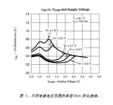 RON會隨著電源電壓的增加而減小。圖1顯示了上海英聯(lián)電子科技有限公司(下文簡稱英聯(lián)電子)的UM4684在不同電源電壓上測得的RON。導(dǎo)通電阻平坦度(RFLAT)即表示RON隨著VIN在0V至VCC或V-至V+)間變化而變化的情況,它是引起THD的主要原因。