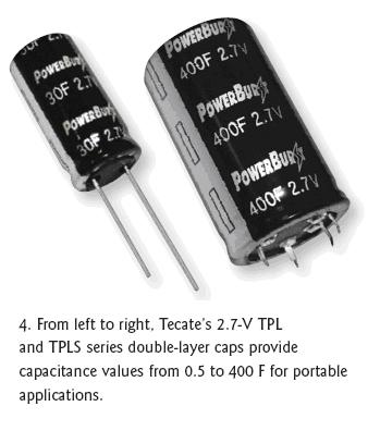 TecateGroup推出了具有多樣配置的多種PowerBurst品牌超級(jí)電容器。針對(duì)通用的脈沖電源、混合電池和便攜式產(chǎn)品應(yīng)用,徑向引線的TPL和徑向折彎的TPLS系列雙層電容器分別具有0.5F到70F和100F到400F的容量(圖4)。這兩類(lèi)器件的電壓額定值都是2.7V,工作溫度范圍是-40℃到65℃。TPL和TPLS系列的最大高度分別是45mm(100F)和60mm(400F)。