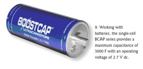 MaxwellTechnologies公司還有許多大型的具有很高容量的BOOSTCAP品牌單節(jié)電容器,不過(guò)工作電壓比較低。BCAP系列共5節(jié),在2.7Vdc的工作電壓下電容值可達(dá)650、1200、11500、2000和3000F(圖9)。這些電容的主要用途是與電池并行工作,適合要求恒定低功率放電以及峰值負(fù)載下提供脈沖功率的應(yīng)用。
