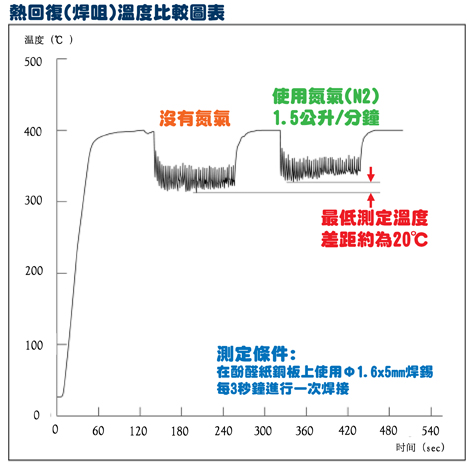下圖表示當(dāng)焊咀前端吹出氮氣和沒有使用氮氣時,焊咀溫度變化的比較。由此可以證明在使用熱氮氣的情況下,如果要把焊點提升到相同的溫度,焊咀便能夠設(shè)定較低的溫度進(jìn)行焊接。