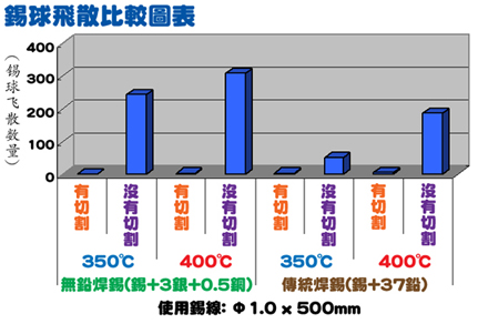 助焊劑飛散跟它的成份有關(guān)系。一般無鉛焊錫都會采用活性很高的助焊劑來改善潤濕性。這類高活性的助焊劑對高溫產(chǎn)生反應(yīng),就像在熱鍋里灑冷水的情況一樣,錫線里的助焊劑急速膨脹而導(dǎo)致飛散。一般含松香的助焊劑也會產(chǎn)生飛散,但大部份只會在高溫的情況下才會發(fā)生。而并非所有含松香助焊劑都會產(chǎn)生這現(xiàn)象,因每個生產(chǎn)商采用不同的化學(xué)配方和活化劑。不論使用那一種助焊劑,一般來說溫度越高,飛散也越多。