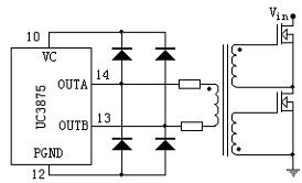 在驅(qū)動(dòng)小功率的MOSFET和IGBT時(shí),如果控制芯片的驅(qū)動(dòng)信號(hào)是圖騰柱輸出方式,且可提供一定的驅(qū)動(dòng)電流,那么可以直接由控制芯片來(lái)驅(qū)動(dòng)變壓器,如圖1所示: