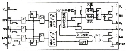 在大功率應(yīng)用場(chǎng)合,由于上述驅(qū)動(dòng)電路受驅(qū)動(dòng)能力的限制,無(wú)法可靠地驅(qū)動(dòng)大型MOSFET、IGBT。而集成驅(qū)動(dòng)器的出現(xiàn)則很好地解決了這一問(wèn)題。國(guó)內(nèi)外已推出了多種具有保護(hù)功能的智能驅(qū)動(dòng)器,如日本產(chǎn)的EXB841、EXB850,國(guó)產(chǎn)的M57959和CWK等。它們具有許多優(yōu)點(diǎn),如電路參數(shù)一致性好、運(yùn)行穩(wěn)定可靠、具有多種保護(hù)功能等。但它們最大的不足是需要單獨(dú)的浮地電源,給系統(tǒng)帶來(lái)了不便。最近IR公司推出了IR2110集成驅(qū)動(dòng)器,它針對(duì)上述驅(qū)動(dòng)器電源系統(tǒng)的不足,設(shè)置了自舉浮動(dòng)電源,只需一路電源即可實(shí)現(xiàn)隔離驅(qū)動(dòng)。對(duì)半橋、全橋式電路特別適用。IR2110的功能框圖如圖3所示。