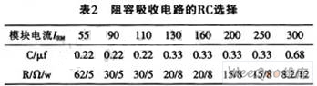 模塊過壓保護一般也可采用阻容吸收法。對于持續(xù)時間較短,能量不大的過電壓,一般可在模塊兩端并聯(lián)阻容吸收電路,用吸收電容把過電壓的電磁能量變成靜電能量存貯起來。而用吸收電阻不但可以防止電路振蕩,還可限制晶閘管導通時電容放電所產(chǎn)生的開通損耗和di/dt值。并聯(lián)在晶閘管開關(guān)模塊的RC值可參考表2。