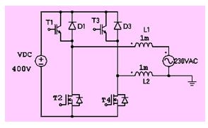 由于上橋臂的igbt工作在50hz的開關頻率下,實際上并不需要對該支路進行濾波。因此對電路拓撲進行優(yōu)化,可以得到圖14所示的發(fā)射極開路型拓撲。這種拓撲的優(yōu)點是只有有高頻電流經(jīng)過的支路才有濾波電感,從而減小了輸出濾波電路的損耗。