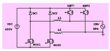 在圖13中,上橋臂igbt的開關頻率一般設定為電網(wǎng)頻率(例如50hz),而下橋臂的mosfet則工作在較高的開關頻率下,例如 16khz,來實現(xiàn)輸出正弦波。仿真顯示,這種逆變器拓撲在2kw額定功率輸出時,效率可以達到99.2%。由于mosfet內(nèi)置二極管的速度較慢,因此 mosfet不能被用在上橋臂。