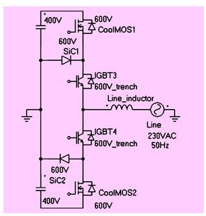 這種拓撲只使用了兩個600v的sic二極管(d4,d6)。d3和d5采用快速si二極管,d7和d8采用小型si二極管,用來防止sic二極管過壓損壞。