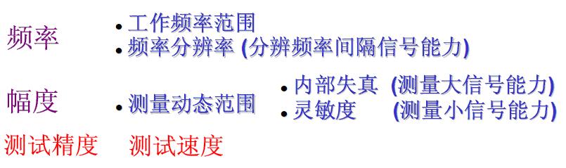 頻譜分析儀的基本性能指標(biāo)如下圖所示,包括頻率、幅度以及測試精度和測試速度。