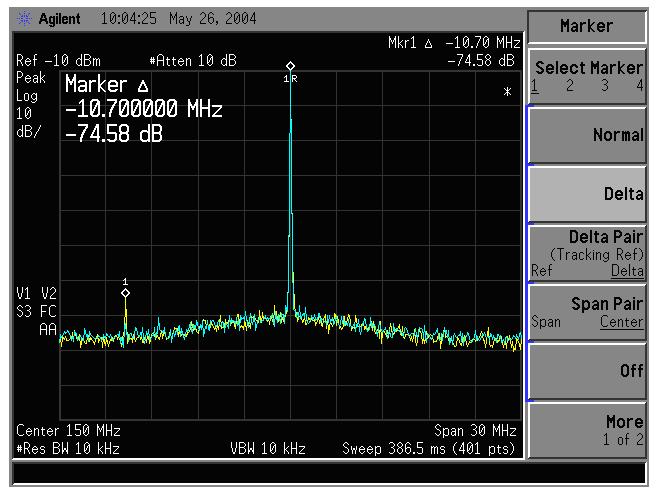 屏幕圖像下端的黃色跡線表示在輸入混頻器被過度激勵時的內(nèi)部失真。衰減為零。藍(lán)色跡線表示當(dāng)衰減設(shè)置為10dB時,雜散信號所減少的電平。