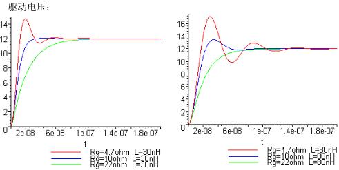 可以看到當Rg比較小時驅動電壓上沖會比較高,震蕩比較多,L越大越明顯,此時會對MOSFET及其他器件性能產(chǎn)生影響。但是阻值過大時驅動波形上升比較慢,當MOSFET有較大電流通過時會有不利影響。
