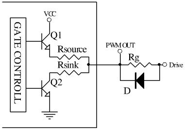 一般IC的PWM OUT輸出如左圖所示,內(nèi)部集成了限流電阻Rsource和Rsink,通常Rsource>Rsink,具體數(shù)值大小同IC的峰值驅動輸出能力有關,可以近似認為R=Vcc/Ipeak。一般IC的驅動輸出能力在0.5A左右,因此Rsource在20Ω左右。