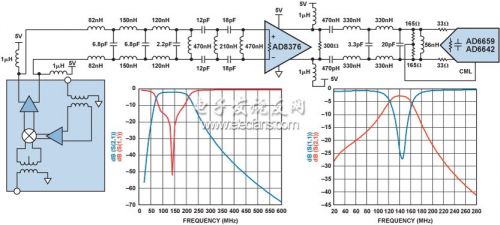 AD8376的電流輸出型電路具有高輸出阻抗,因此其差分輸出需要接150 Ω電阻實現(xiàn)電壓輸出。另一個差分濾波器放置在AD8376和ADC之間,用于衰減二階和三階諧波失真成分,因此該150 Ω負載可以被分成兩部分。首先將300 Ω電阻安裝于AD8376的輸出端。另一個300 Ω電阻由兩個165 Ω電阻和ADC的3 kΩ輸入阻抗構成。兩個165 Ω電阻同時為ADC輸入提供直流共模電壓。LC濾波器的輸入和輸出阻抗均為300 Ω。對于高中頻應用,信號源和負載的阻抗的完美匹配是非常重要的。完整接口如圖4所示。