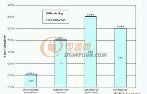 低壓側(cè)IGBT同樣有同一問(wèn)題。究竟哪一種IGBT才能提供最低的功耗?由于這些IGBT只會(huì)進(jìn)行 50Hz或60Hz切換,如圖5所示,標(biāo)準(zhǔn)速度IGBT可提供最低的功耗。雖然標(biāo)準(zhǔn)IGBT會(huì)帶來(lái)一些開關(guān)損耗,但數(shù)值并不足以影響IGBT的總功耗。事實(shí)上,最新的槽柵IGBT仍然擁有較高的功耗,因?yàn)檫@一代的槽柵IGBT專門針對(duì)高頻率應(yīng)用而設(shè)計(jì),以平衡開關(guān)和導(dǎo)通損耗為目標(biāo)。因此,對(duì)低壓側(cè)IGBT 來(lái)說(shuō),標(biāo)準(zhǔn)速度平面式IGBT仍然是必然選擇。