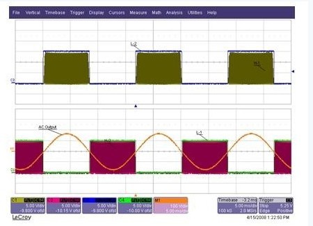 脈寬調(diào)制這些IGBT的最佳方法是什么?怎樣才能把功耗降到最低呢?方法之一是僅對(duì)高壓側(cè)IGBT進(jìn)行脈寬調(diào)制,對(duì)應(yīng)的低壓側(cè)IGBT以50Hz或60Hz換相。圖2所示為一個(gè)典型的柵壓信號(hào)。當(dāng)Q1 正進(jìn)行脈寬調(diào)制時(shí),Q4維持正半周期操作。Q2和Q3在正半周期保持關(guān)斷 。到了負(fù)半周期,當(dāng)Q3進(jìn)行脈寬調(diào)制時(shí),Q2保持開啟狀態(tài)。Q1和Q4會(huì)在負(fù)半周期關(guān)斷。圖2 也顯示了通過(guò)輸出濾波電容器C1的AC正弦電壓波形。
