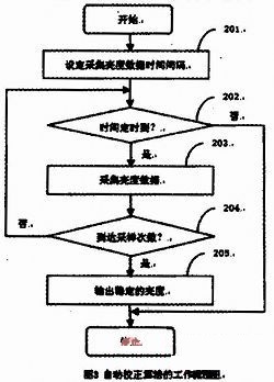 亮度感應(yīng)自動控制的自動校正算法的步驟:首先設(shè)定采集亮度數(shù)據(jù)的時間間隔以及設(shè)定采樣次數(shù);當(dāng)時間間隔定時到時,讀取光感應(yīng)器亮度的數(shù)據(jù);當(dāng)采樣次數(shù)到達預(yù)設(shè)次數(shù)后,輸出穩(wěn)定的亮度;再由CPU輸出穩(wěn)定的PWM,去控制液晶面板的背光。設(shè)定采集亮度數(shù)據(jù)時間間隔201是初始化每次采集光感應(yīng)器亮度的時間。時間定時到202是達到可以去采集光感應(yīng)器亮度的時間。采集亮度數(shù)據(jù)203是CPU讀取光感應(yīng)器亮度數(shù)據(jù)通過ADC的數(shù)字信號的數(shù)值。到達采樣次數(shù)204是到達采集亮度數(shù)據(jù)都一樣的次數(shù),表示環(huán)境亮度已經(jīng)穩(wěn)定,不再變化。輸出穩(wěn)定的亮度205是CPU輸出穩(wěn)定的PWM去控制液晶面板的背光。如圖3亮度感應(yīng)自動控制的自動校正算法的工作流程所示。