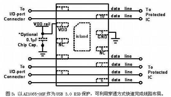 AZ1065系列產(chǎn)品提供了六個極低電容的引腳,可同時保護USB 3.0的兩組差動對(TX和RX)及USB 2.0的差動對(D+和D-),具有減小PCB面積和降低布局復雜度等優(yōu)點,并可大幅節(jié)省系統(tǒng)成本。更特別的是,AZ1065-06F率先采用交錯型的引腳,以便PCB布局時可利用穿透式(Feedthrough)方式實現(xiàn)完美設計,圖3顯示了AZ1065-06F的接線方式。