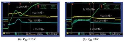 在不同的柵級電壓下測量短路電流,測試波形如圖2所示,采用的功率MOSFET為AOT266。圖2(a):VGS電壓為13V,短路電流達(dá)1000A,MOSFET在經(jīng)過47μs后電流失控而損壞;圖2(b):VGS電壓為8V,短路電流僅為500A,MOSFET在經(jīng)過68μs后電流失控而損壞。電流測試使用了20:1的電流互感器,因此電流為200A/格。
