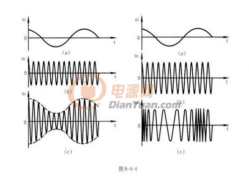 調(diào)幅波的特點是頻率與載波信號的頻率相等,幅度隨輸入信號幅度的變化而變化;調(diào)頻波的特點是幅度與載波信號的幅度相等,頻率隨輸入信號幅度的變化而變化;調(diào)相波的特點是幅度與載波信號的幅度相等,相位隨輸入信號幅度的變化而變化。調(diào)幅波和調(diào)頻波的示意圖如圖8-4-4所示。