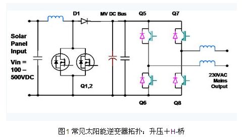升壓+H-橋拓?fù)涫翘?yáng)能逆變器極為常用的拓?fù)渲?,是一種兩級(jí)非隔離拓?fù)洹F涞谝患?jí)是升壓級(jí),用于把模塊的可變輸出電壓(例如100V – 500V)升高到更大的中間電壓,后者必須大于實(shí)際峰值主線電壓(如230V x sqrt(2),或>325V)。該升壓級(jí)還有一個(gè)重要作用,就是為了實(shí)現(xiàn)效率最大化,太陽(yáng)能模塊必須運(yùn)作產(chǎn)生盡可能大的功率,而太陽(yáng)能模塊的功率 曲線可通過(guò)輸出電流乘以輸出電壓數(shù)值獲得。功率特性中有一個(gè)最大點(diǎn),被稱(chēng)為“最大功率點(diǎn)”或MPP,而這精確位置會(huì)隨著模塊的類(lèi)型、溫度和日照陰影等因素而變化。