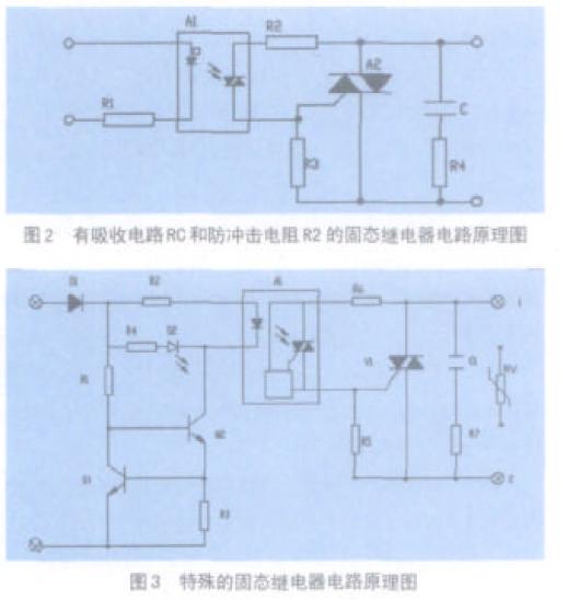 圖1、圖2 和圖3 三種電路都能實(shí)現(xiàn)固態(tài)繼電器的功能。圖1 是固態(tài)繼電器最簡單的電路原理圖,圖中A1 是交流光耦,A 2 是雙向可控硅。常用在小型的S S R ,使用時(shí),用戶往往在外面增加器件來改善性能。圖2 是在圖1 的基礎(chǔ)上增加了RC 吸收電路和防沖擊電阻R2 。R 2是保護(hù)光耦,抑制在導(dǎo)通瞬間流過光耦的沖擊電流。附加這些器件后,大大改善了SSR 的EMC 特性和浪涌對光耦的沖擊性能。因此該電路常用在可靠性較高的場合。圖3 是一種特殊的電路,常用在高可靠性和E M C 等級(jí)較高的SSR 設(shè)計(jì)中。圖中的二極管D1 可防止輸入反極性。由Q1、Q2、R1 及R3 組成恒流電路,保證當(dāng)輸入電壓變化時(shí),光耦A(yù) 1 的電流恒定。R C 電路C 1 、R 7 和R 6 的功能與圖2 的相同。該電路還增加了壓敏電阻R V 。R V不僅加強(qiáng)了S S R 的過壓保護(hù)能力,而且大大改善了其E M C 性能。