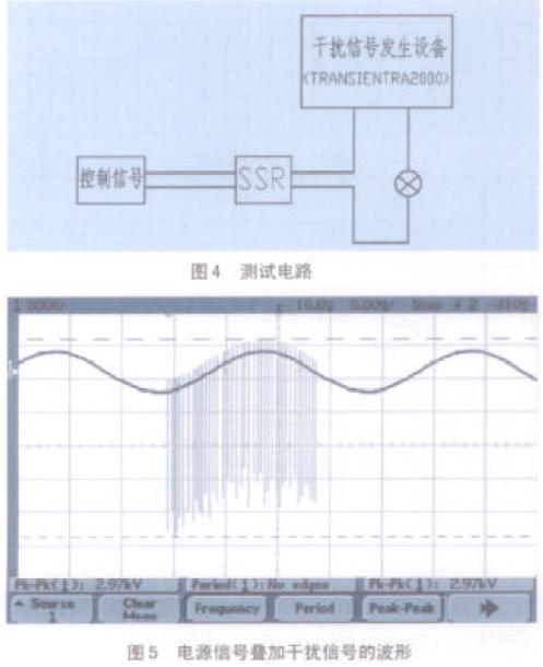 圖4 所示為測試電路。對SSR 來說,有信號(hào)源(穩(wěn)壓電源)、小于1 米的連線、負(fù)載及有關(guān)儀器;圖5 為電源信號(hào)疊加干擾信號(hào)的波形。