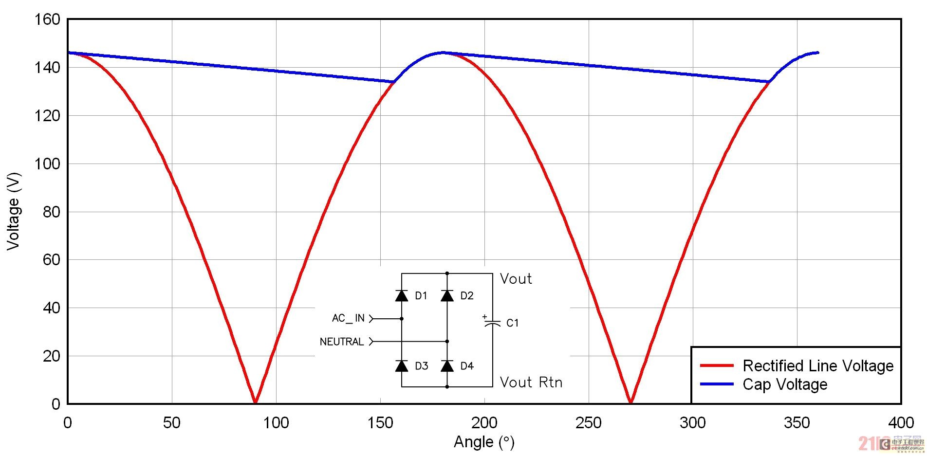 圖 1 和圖 2 顯示了離線電源中使用的兩種整流器配置結(jié)構(gòu)。圖 1 為一個全波橋接,其中,AC 輸入電壓經(jīng)過簡單整流以后便被送至電容。這種電路常見于寬范圍 AC 和 230 伏 AC 應(yīng)用中。電容充電至正弦波峰值,然后在大部分半周期放電。電容紋波電流包括兩個部分:首先是充電周期,其電流由電容值和所應(yīng)用的 dV/dt 決定;其次是電容放電。電源起到恒定電源負(fù)載的作用,因此電容以非線性速率實(shí)施放電,其計(jì)算方法為:W = ½ * C *V^2 = P * dt。
