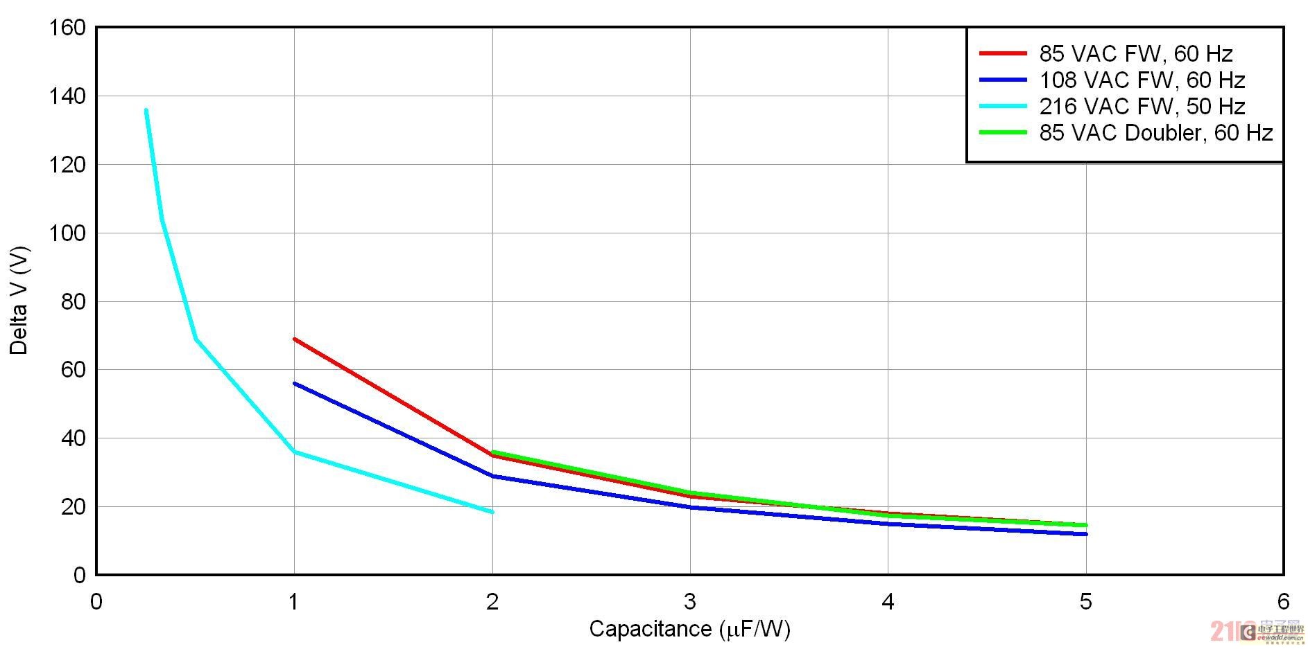 圖 3 顯示了四種整流器/輸入電壓方法的 uF/W 標(biāo)準(zhǔn)化壓降。共有三種全波橋接方法,適用于低線壓美國(108 VAC/60 Hz)、低線壓日本(85 VAC/50 Hz)和低線壓歐洲(216 VAC/50 Hz)。另外,還有一個低線壓日本的倍壓器。就全波橋而言,標(biāo)準(zhǔn)化過程只需將電容除以功率。在倍壓器中,標(biāo)準(zhǔn)化方法是將兩個串聯(lián)電容之一的電容除以功率。要想使用該曲線圖,請首先確定您的整流器配置結(jié)構(gòu),并選擇一個可以接受的壓降。之后,您只需讀取輸入電容的 uF/W 便可。最后,通過乘以您的功率,便可去標(biāo)準(zhǔn)化。