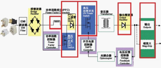 在一個電源設計中,能效規(guī)范對電路段的挑戰(zhàn)主要體現(xiàn)在PFC能效、主轉換器能效和次級能效幾個方面。要提高這幾個方面的能效,就必須改善如圖1所示電路紅色框中的元件性能。以下將介紹改善電路段能效的幾種方法。
