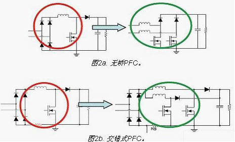 改善PFC能效的目標是為了實現(xiàn)功率因數(shù)校正短的效率達到96%以上。采用無橋PFC(圖2a)可以減少橋損耗,采用交錯式PFC(圖2b)可以滿足較高功率應用的要求,以提升PFC能效。此外,還可以利用IC技術減少開關損耗,并利用更優(yōu)化的拓撲結構來減少EMI濾波器損耗。