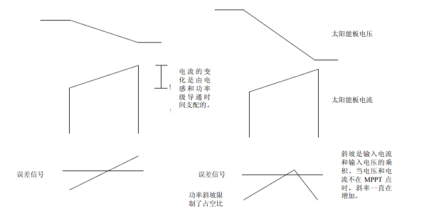為了從功率可變的電源(即太陽(yáng)能電池板)析取出最大的功率,太陽(yáng)能控制器必須采用 MPPT。MPPT 必須首先找到最大功率點(diǎn)并及時(shí)調(diào)整環(huán)境條件,以保持控制器接近最大功率點(diǎn)。動(dòng)態(tài) MPPT 用在系統(tǒng)發(fā)生改變的情況下。由于每個(gè)開關(guān)周期都在發(fā)生變化,太陽(yáng)能電池板汲取的功率也會(huì)在每個(gè)周期有明顯的改變。動(dòng)態(tài)MPPT利用太陽(yáng)能電池板的電壓驟降乘以每個(gè)開關(guān)周期增加的電流,以確定將要產(chǎn)生的誤差信號(hào)來調(diào)節(jié)占空比。動(dòng)態(tài)響應(yīng)可檢測(cè) IV 曲線的斜率,從而建立一個(gè)功率斜坡,從誤差信號(hào)相交點(diǎn)建立一個(gè)代表占空比的功率。當(dāng)斜坡變化斜率從正到負(fù)時(shí)該周期結(jié)束,如圖 2 所示。