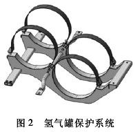 ( 2) 氫氣罐保護(hù)。高壓氫氣罐的固定支架和鋼帶應(yīng)有足夠的強度,以保證在碰撞過程中,高壓氫氣罐的動態(tài)位移不會太大,避免造成連接管路的斷裂、變形和氫氣的大量泄漏。何?。?3]基于顯式有限元理論,按照 CMVDR294 法規(guī)對國內(nèi)自主開發(fā)的某燃料電池轎車進(jìn)行正面碰撞分析,對比分析兩種氫氣罐保護(hù)系統(tǒng)設(shè)計方案的計算結(jié)果,提出了安全有效的氫氣罐保護(hù)方案,即氫氣罐保護(hù)系統(tǒng)采用整體式設(shè)計。如圖 2 所示,氫氣罐框架通過 3 根橫梁和 2 根縱梁將兩個氫氣罐集成到一個框架總成??v梁截面為“Π”形,由幾塊板材拼焊而成,中部設(shè)計出兩個圓弧形凹槽,可以對氫氣罐進(jìn)行有效的固定和保護(hù)。