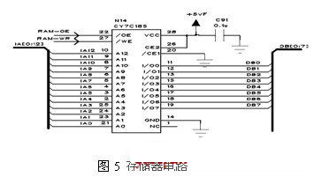 通過軟件參與設(shè)置,很容易得到全頻段內(nèi)的預置誤差數(shù)據(jù)。對于2-20GHz的微波振蕩器,如果每隔5MHz設(shè)置補償一個點,那么存儲器至少需要3600個地址空間,在此選擇8k×8靜態(tài)存儲器芯片,存儲空間滿足要求。在時鐘的同步控制下,地址生成器產(chǎn)生對應(yīng)地址,該系列數(shù)據(jù)被存入RAM中,電路如圖5所示。