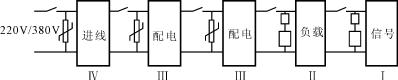 從圖1可以看出,在220V/380V線路中的每一區(qū)域,都應(yīng)該在其前面并聯(lián)氧化鋅壓敏電阻器或過電壓保護器,雷電感應(yīng)過電壓能量將通過逐級的防雷器件吸收和釋放到大地中,達到保護線路和設(shè)備免受雷電破壞的目的;雖然應(yīng)用于Ⅳ、Ⅲ區(qū)域的過電壓保護器具有自身劣化斷開電源的功能,但考慮到不同的接地狀況,還應(yīng)與過電壓保護器串聯(lián)合適的熔斷器或空氣開關(guān).