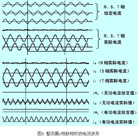 如果由于線路缺相,CT也檢測(cè)不到電流(例如r相電流ir=0),則由于平衡控制會(huì)使另外兩相電流的相位差變?yōu)?80°,幅值相等(當(dāng)然為補(bǔ)償“缺相”的那相電流,另兩相電流將增大),以滿足矢量和為零的控制要求,如圖8所示。此時(shí),根據(jù)r、s、t相實(shí)際電流計(jì)算出的有功分量電流iq和無功分量電流id已經(jīng)不是正常直流量,而是含有2倍頻(相電流頻率)成份的交流量,參見圖8,整流器無法正常工作。