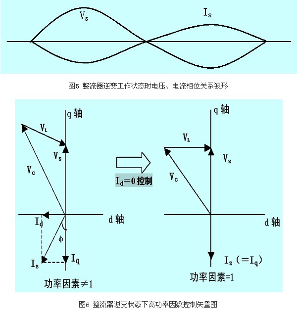 鑒于整流器和逆變器相互之間是分別獨(dú)立運(yùn)行的,它們是分別獨(dú)立可控的,能對(duì)整流器的功率因數(shù)進(jìn)行獨(dú)立控制,而不受馬達(dá)負(fù)荷及運(yùn)轉(zhuǎn)速度的影響,如圖2所示。