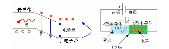 LED是電子二極管的一種,主要構(gòu)造是PN結(jié)。如圖1,當(dāng)向LED的兩端施加電壓,電子就會吸收能量并向價(jià)電子帶轉(zhuǎn)移,然后再將吸收的能量釋放出來。這個(gè)被釋放出的能量就是光。放出的光的波長和顏色是由半導(dǎo)體的電勢差決定的。