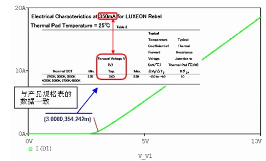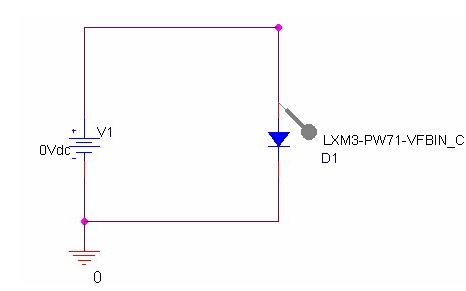 首先運(yùn)用圖2的電路來驗(yàn)證LED的電子特性。要得到電壓-電流特性,需要進(jìn)行直流解析。