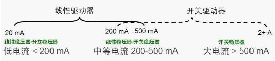 如今在市場上典型的LED驅(qū)動器包括兩類,即線性驅(qū)動器和開關(guān)驅(qū)動器;大概的適用范圍見圖5.如電流大于500mA的大電流應(yīng)用采用開關(guān)穩(wěn)壓器,因?yàn)榫€性驅(qū)動器限于自身結(jié)構(gòu)原因,無法提供這樣大的電流;而在電流低于200mA的低 電流應(yīng)用中,通常采用線性穩(wěn)壓器或分離穩(wěn)壓器;而在200至500mA的中等電流應(yīng) 用中,既可以采用線性穩(wěn)壓器,也可以采用開關(guān)穩(wěn)壓器。