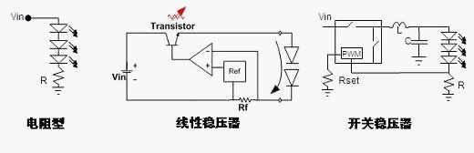 開關(guān)穩(wěn)壓器的能效高,且提供極佳的亮度控制。線性穩(wěn)壓器結(jié)構(gòu)比較簡單,易于設(shè)計(jì),提供穩(wěn)流及過流保護(hù),且沒有電磁兼容性(EMC)問題。