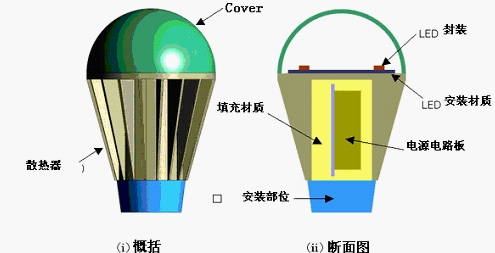 要避免電子設(shè)備的發(fā)熱有多種方法。比如,加散熱器,在熱源周圍安置能提供冷氣的風(fēng)扇。前者是通過增加散熱面積,來增加散熱的通道,后者是使熱不在熱源周圍聚集。但是,正如圖1 LED燈的概括圖所示,LED封裝時(shí)不能直接連接散熱器,也沒有安裝風(fēng)扇的位置。而且內(nèi)部電源電路板也會產(chǎn)生熱量,因此LED燈的散熱問題可以說是一個(gè)非常棘手的問題。這樣,如何有效使用LED安裝材質(zhì)和散熱器就變得很重要。