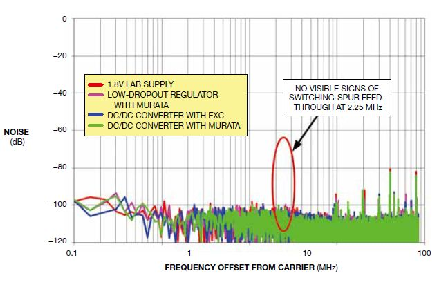 測(cè)試結(jié)果表明,在300MHz的中間頻率下,當(dāng)用開(kāi)關(guān)穩(wěn)壓器供電時(shí),SNR性能比低噪聲低壓差穩(wěn)壓器下降了大約0.3dB.而各種方式的SFDR性能幾乎相同。通過(guò)仔細(xì)觀(guān)察正態(tài)化的FFT圖(開(kāi)始于輸入信號(hào),繪制的是噪聲與偏移頻率關(guān)系圖),表明當(dāng)使用次優(yōu)的EXC鐵氧體磁環(huán)時(shí),整個(gè)Nyquist區(qū)中的背景噪聲略有升高,而沒(méi)有任何開(kāi)關(guān)頻率饋入的跡象(圖5)。