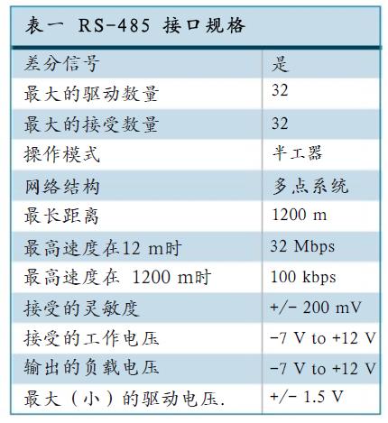 表一詳細的說明了RS-485 接口的規(guī)范。主要的參數(shù)包括-7V 到+12V 的工作電壓,32Mbps 的數(shù)據(jù)傳輸速度已經(jīng)1200 米的傳輸距離等。一個完全兼容的RS-485 接口必須符合 IEC61000-4-2(靜電),IEC61000-4-4(群脈沖)和 IEC61000-4-5 (浪涌)標準。
