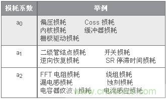 表1概括總結了各種電源損耗項及其相關損耗系數(shù),該表提供了一些最佳化電源效率方面的折中方法。例如,功率MOSFET導通電阻的選擇會影響其柵極驅動要求及Coss損耗和潛在的緩沖器損耗。低導通電阻意味著,柵極驅動、Coss 和緩沖器損耗逆向增加。因此,您可通過選擇MOSFET來控制a0和a2。