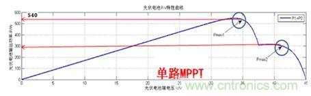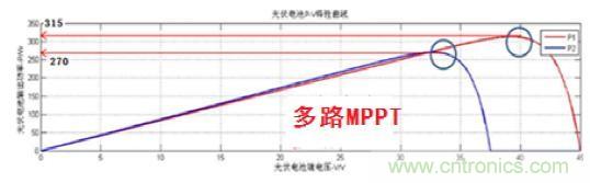 因?yàn)楣夥姵仃嚵惺菃挝还夥姵亟M串組成的,每個組串都有自己的工作電壓,電壓很大概率上不一致,如果以傳統(tǒng)的集中式方案的話,組串在匯流箱能量匯集時并聯(lián)會發(fā)生一次并聯(lián)失配,匯流箱到逆變器能量并聯(lián)時再發(fā)生一次并聯(lián)失配,嚴(yán)重影響光伏電池組件的發(fā)電效率。如下圖3所示,單路MPPT的情況下,光伏電池組件受到各種因素的影響,會導(dǎo)致出現(xiàn)兩個或多個波峰的情況,跟蹤到任何一個波峰都會對發(fā)電量造成損失。而如果多路MPPT的情況下,能精確跟蹤到每一個組串的特性,形成多條MPPT曲線,使得每串光伏電池組串最大效能的發(fā)揮作用。