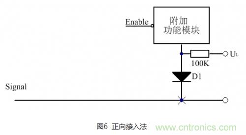 反向接入方法如圖7所示,與正向接入不同的是,二極管的正極接到信號(hào)線上,UH接至高電平。
